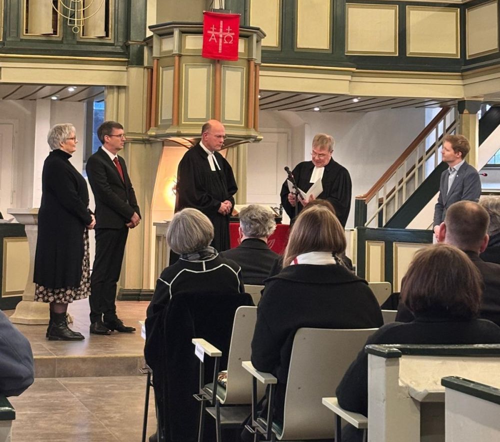 Landessuperintendent Dietmar Arends (2.v.r.) führte Pfarrer Thomas Weßler (Mitte) in das Amt des Superintendenten der Klasse West ein. Foto: Ev.-ref. Kirchengemeinde Wüsten