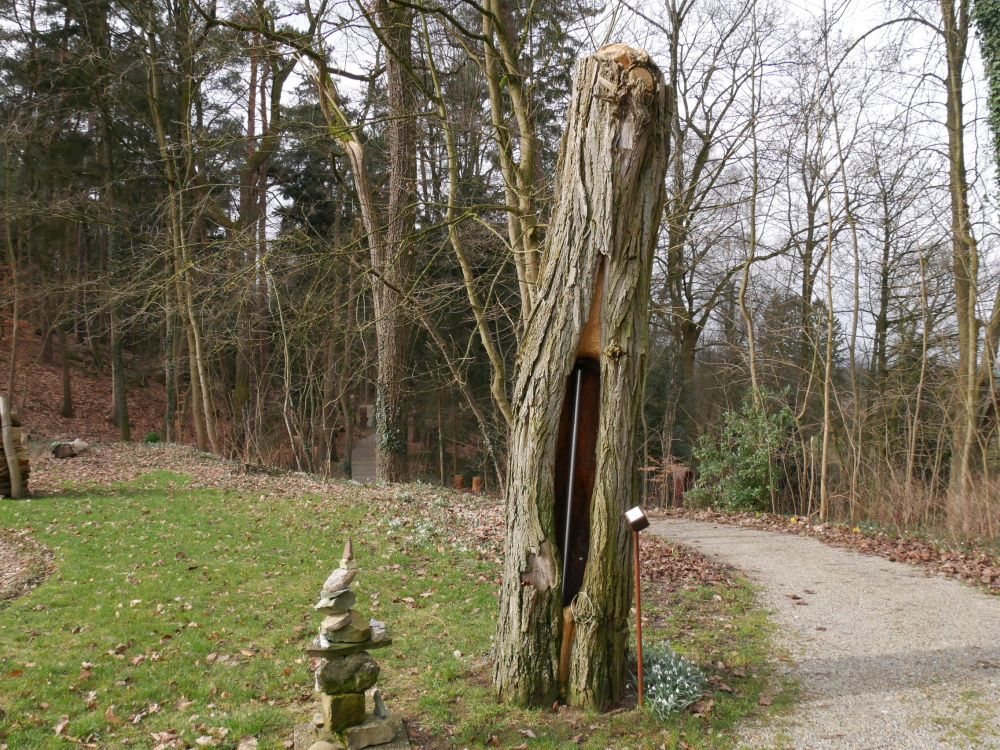 Ein Weg, eine Rasenfläche mit altem Laub, entlaubte Bäume im Hintergrund, am Weg im Vordergrund ein hohler Baumstamm, der Klangbaum, in dem man eine Stange aus Metall sehen kann.